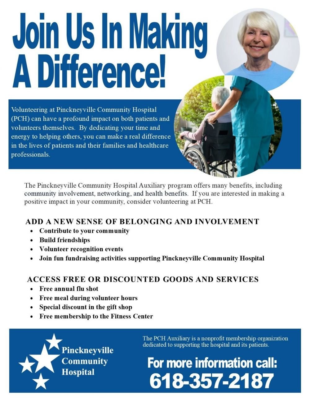For more information on joining the Pinckneyville Community Hospital Auxiliary, please call 618-357-8898 .