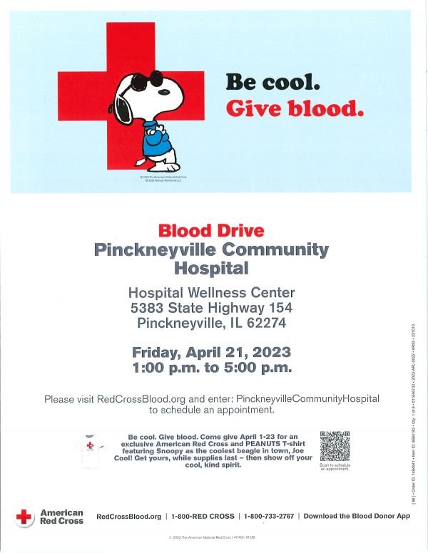 The American Red Cross is hosting a blood drive at Pinckneyville Community Hospital on Friday, April 21 from 1 pm to 5 pm. Go to RedCrossBlood.org and search for PinckneyvilleCommunityHospital to schedule your appointment.