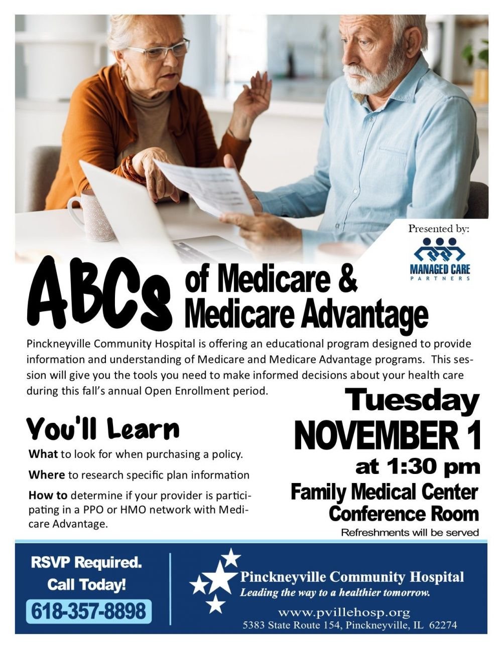 Pinckneyville Community Hospital is offering an educational program designed to provide information and understanding of Medicare and Medicare Advantage programs. This session will give you the tools you need to make informed decisions about your health care during this fall’s annual Open Enrollment period.